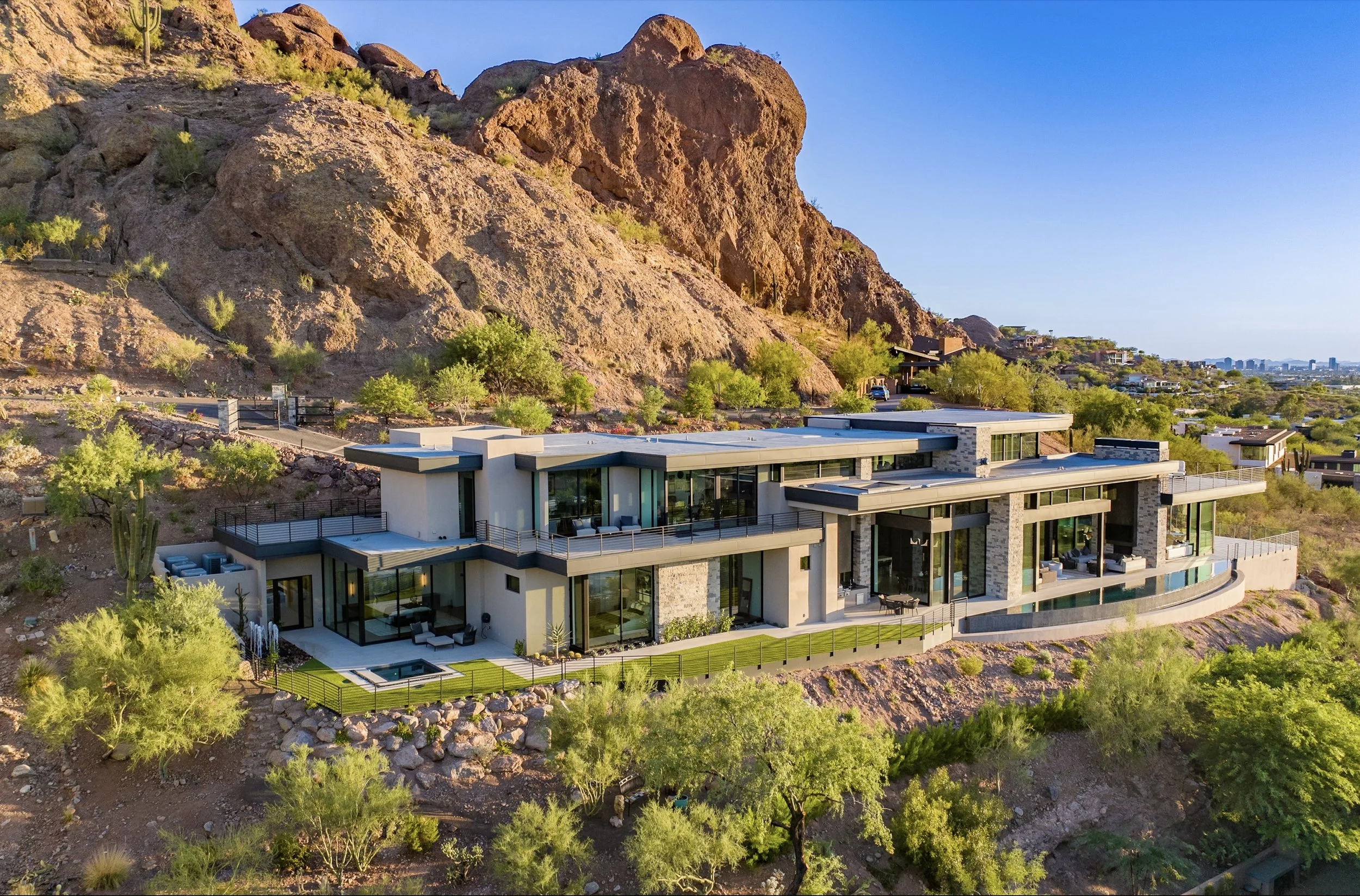 This 9,031 square-foot masterpiece at Camelback Mountain reflects the inspired work of acclaimed architect CP Drewett and renowned builder Brett Brimley. The contemporary architecture of this estate is spectacular, amplified superbly by expansive and towering glass walls with exceptional mountain, golf and city lights views.